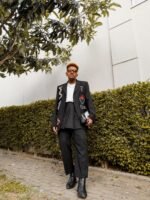 Blazer em alfaitaria, na cor preta, com bordados manuais coloridos, aviamentos (strass e vidrilhos).